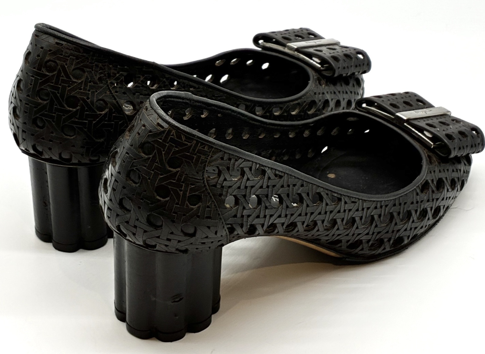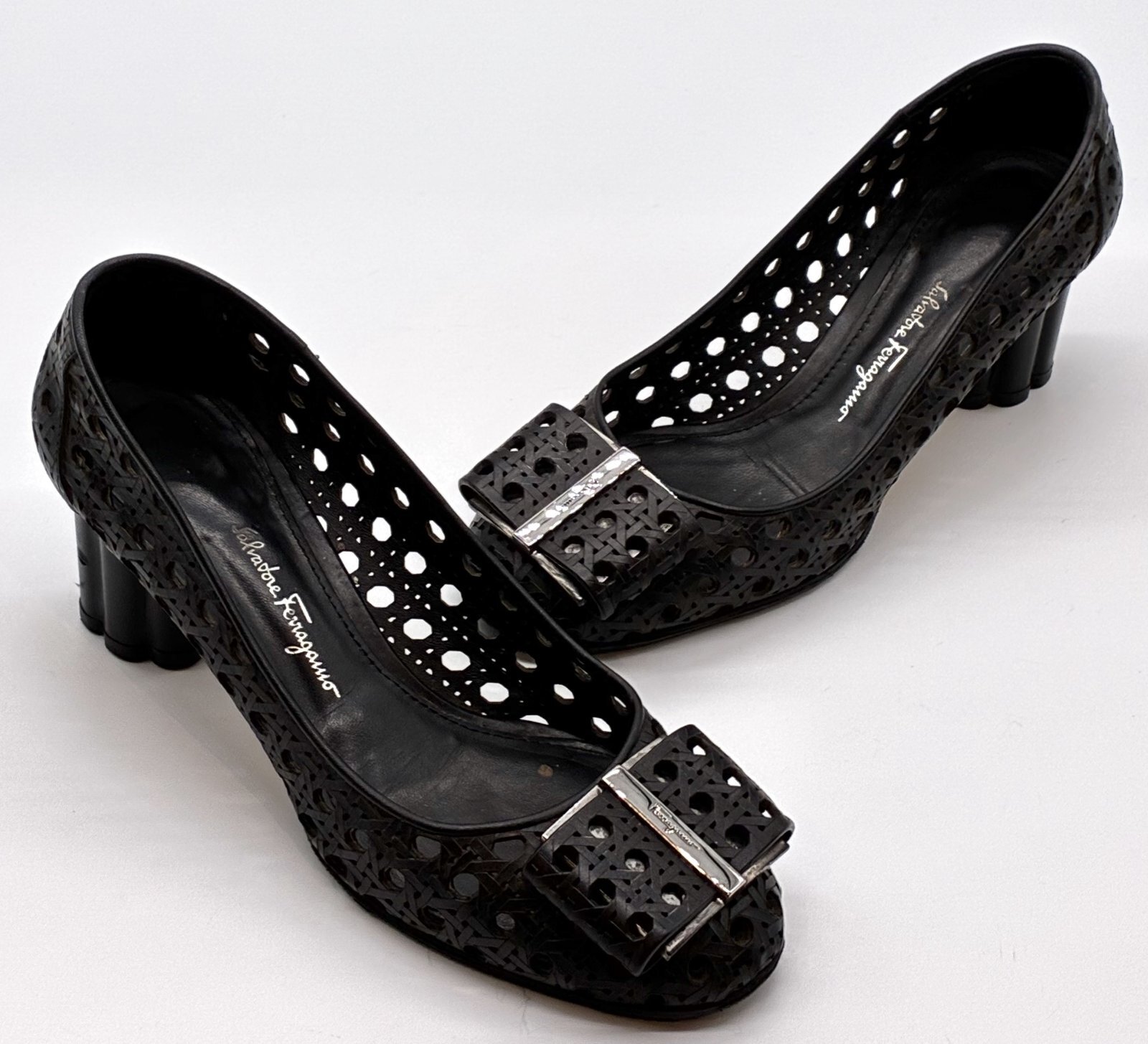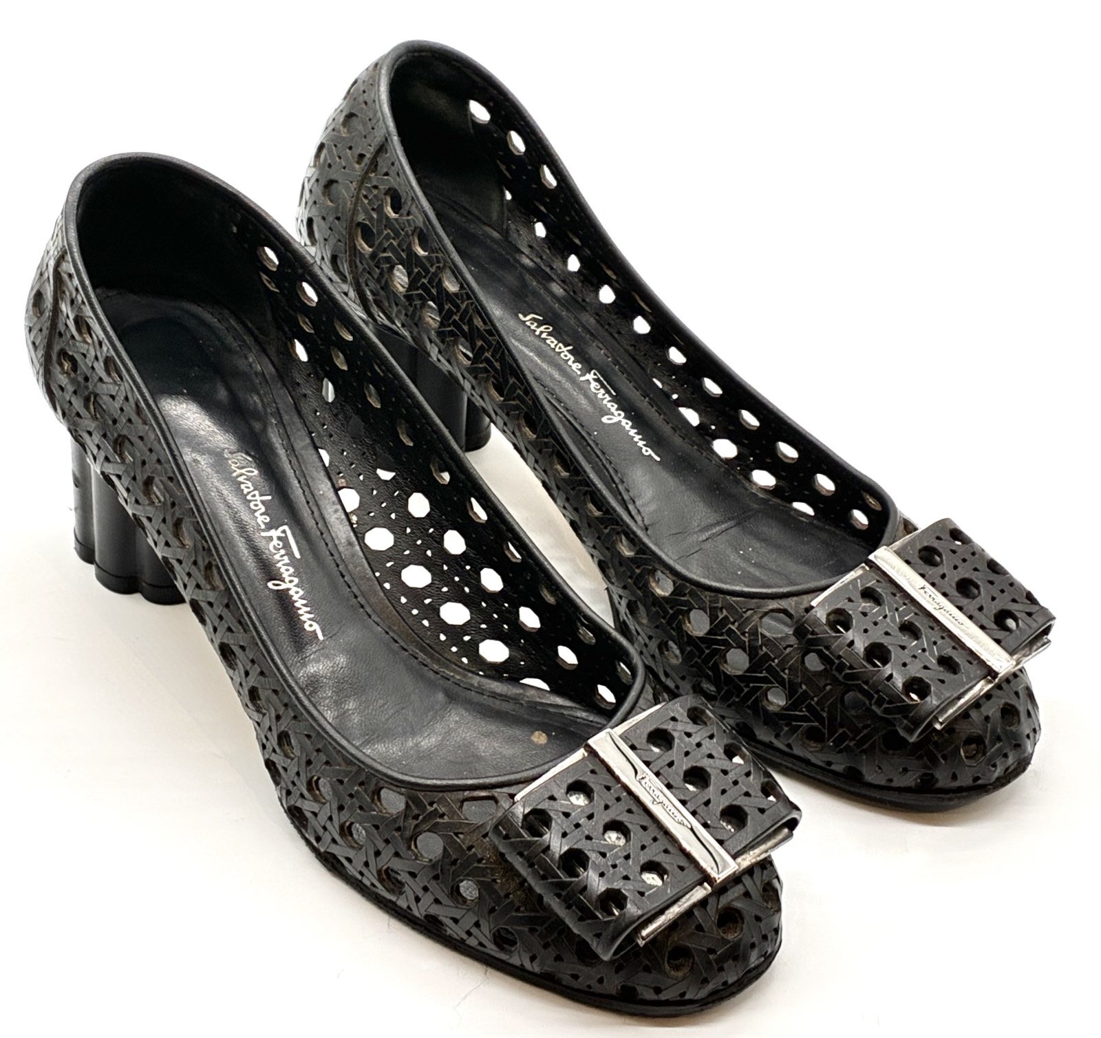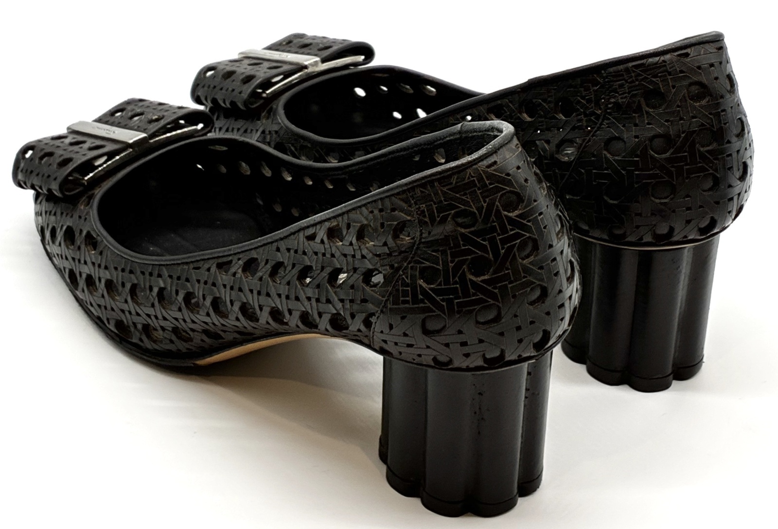 OLD FERRAGAMO(オールドフェラガモ) ブラックメッシュ×レーザーカッティングリボンフラワーヒールパンプス 5 1/2D