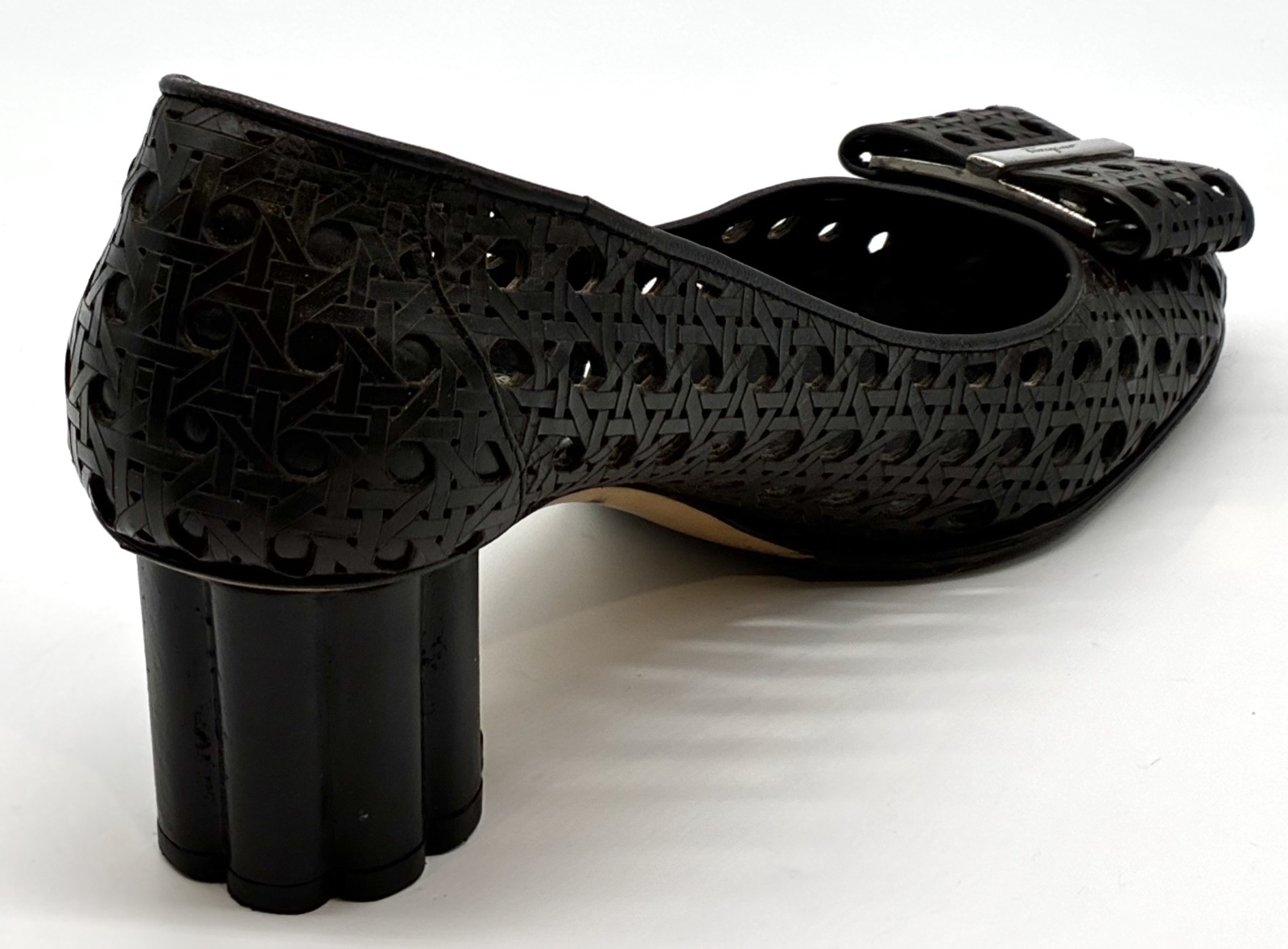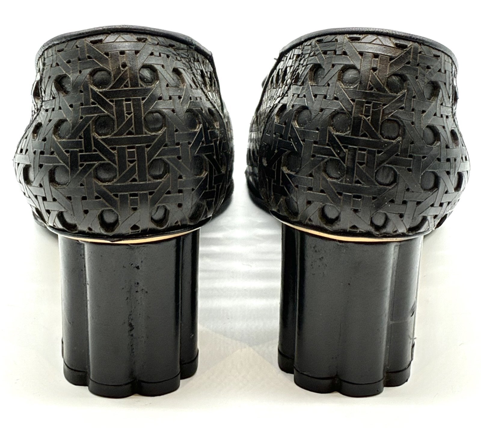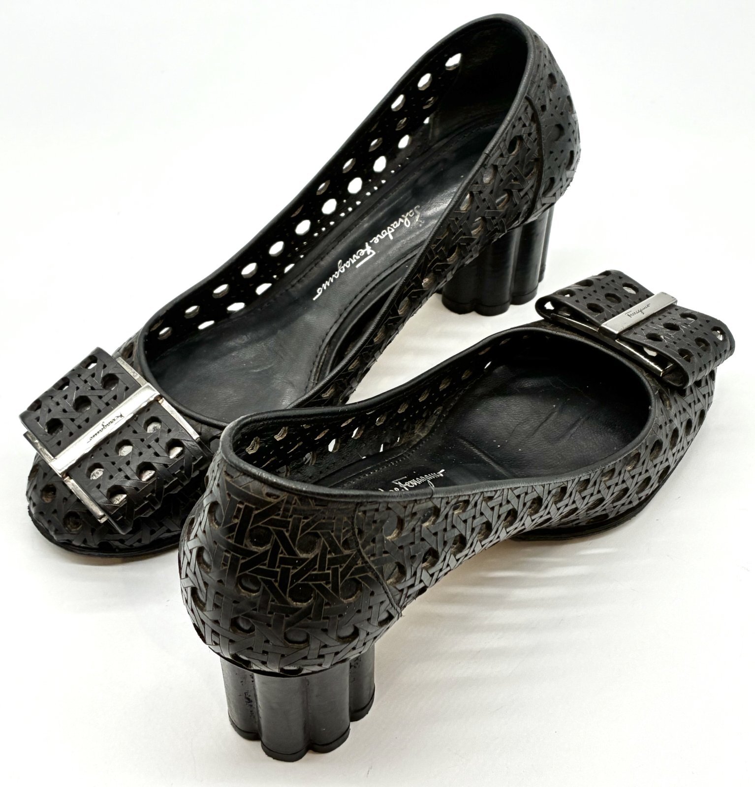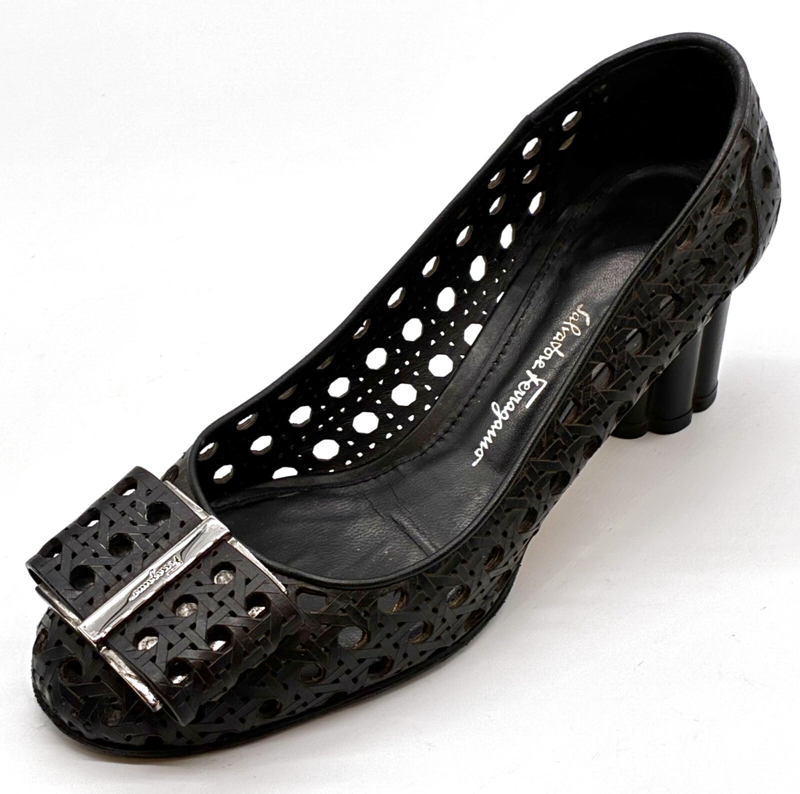 OLD FERRAGAMO(オールドフェラガモ) ブラックメッシュ×レーザーカッティングリボンフラワーヒールパンプス 5 1/2D
